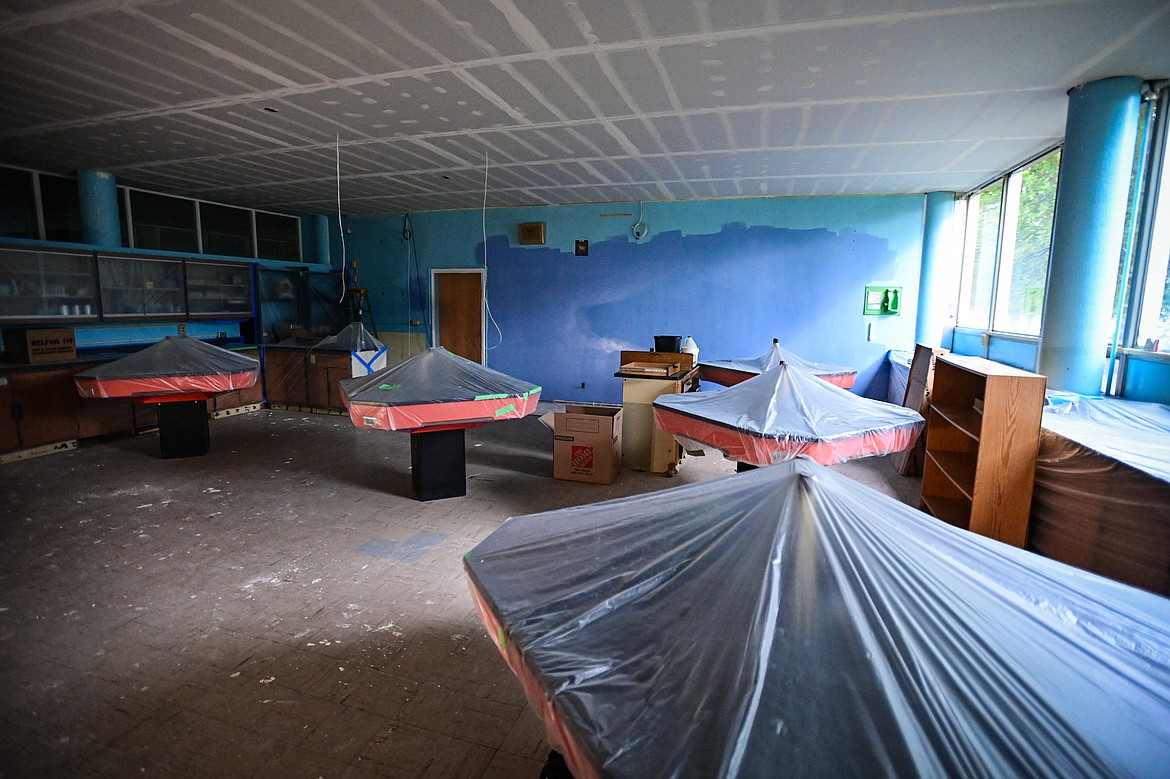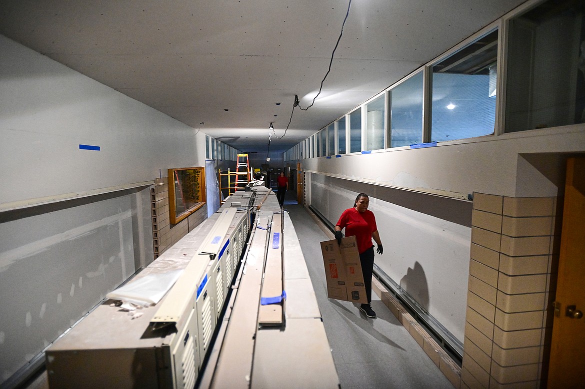 During a building tour Sept. 17, the sound of power tools reverberated through the school. A temporary wall has been put up on the first floor, not far from the main office, to separate students from the construction zone. Upstairs, crews from Belfor Property Restoration were in full force in hallways and empty classrooms in various states of repair to finish the project by the deadline.