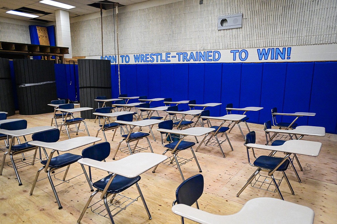 The remaining classes continue to be held at the high school in rooms unaffected by construction. The wrestling room, for example, was turned into a classroom with plywood placed over the mats to protect them from desks. The library has been divided up with partitions to move special education classes into a quiet space.