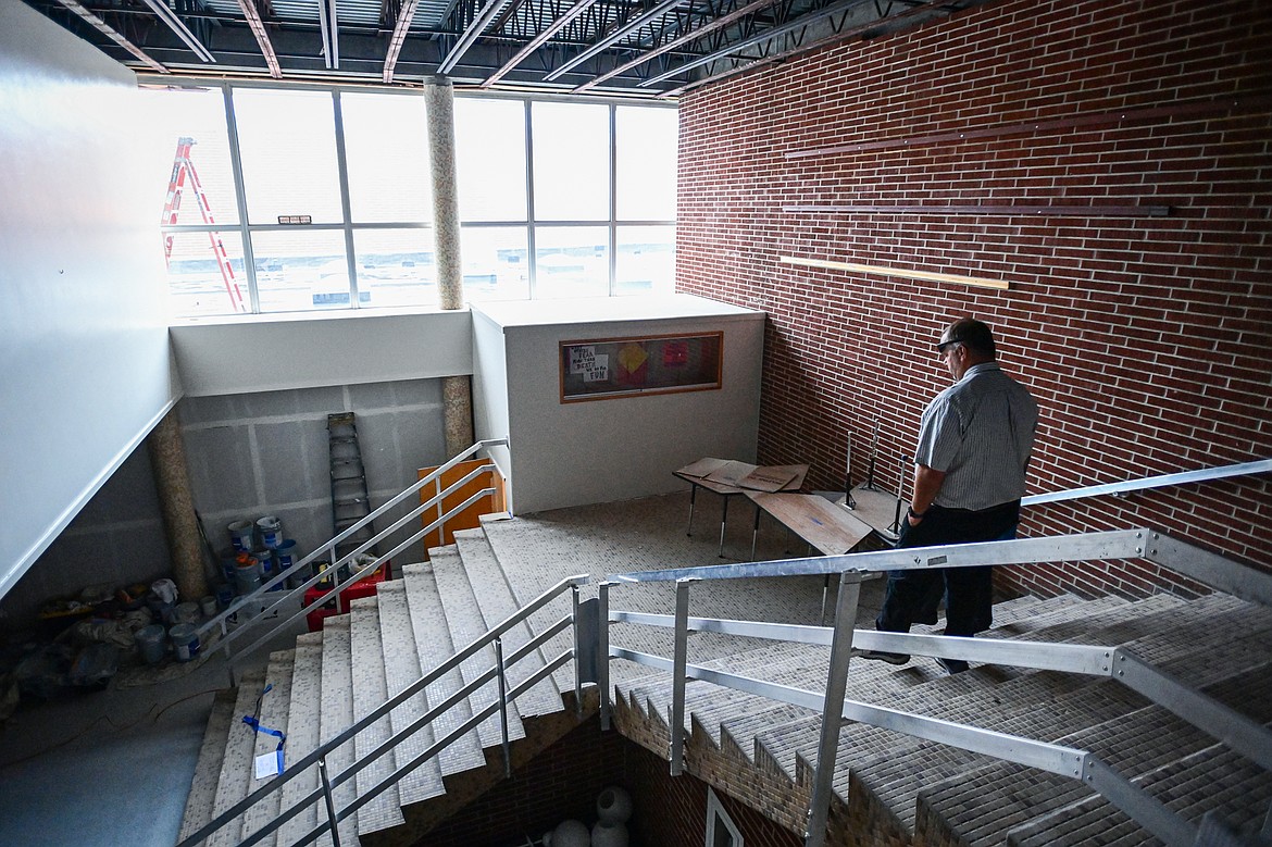 Superintendent Cory Dziowgo descends a staircase inside the classroom wing of Columbia Falls High School on Tuesday, Sept. 17. A late-July rainstorm caused significant water damage after ongoing roof construction left the wing exposed. (Casey Kreider/Daily Inter Lake)ARTICLES BY HILARY MATHESON