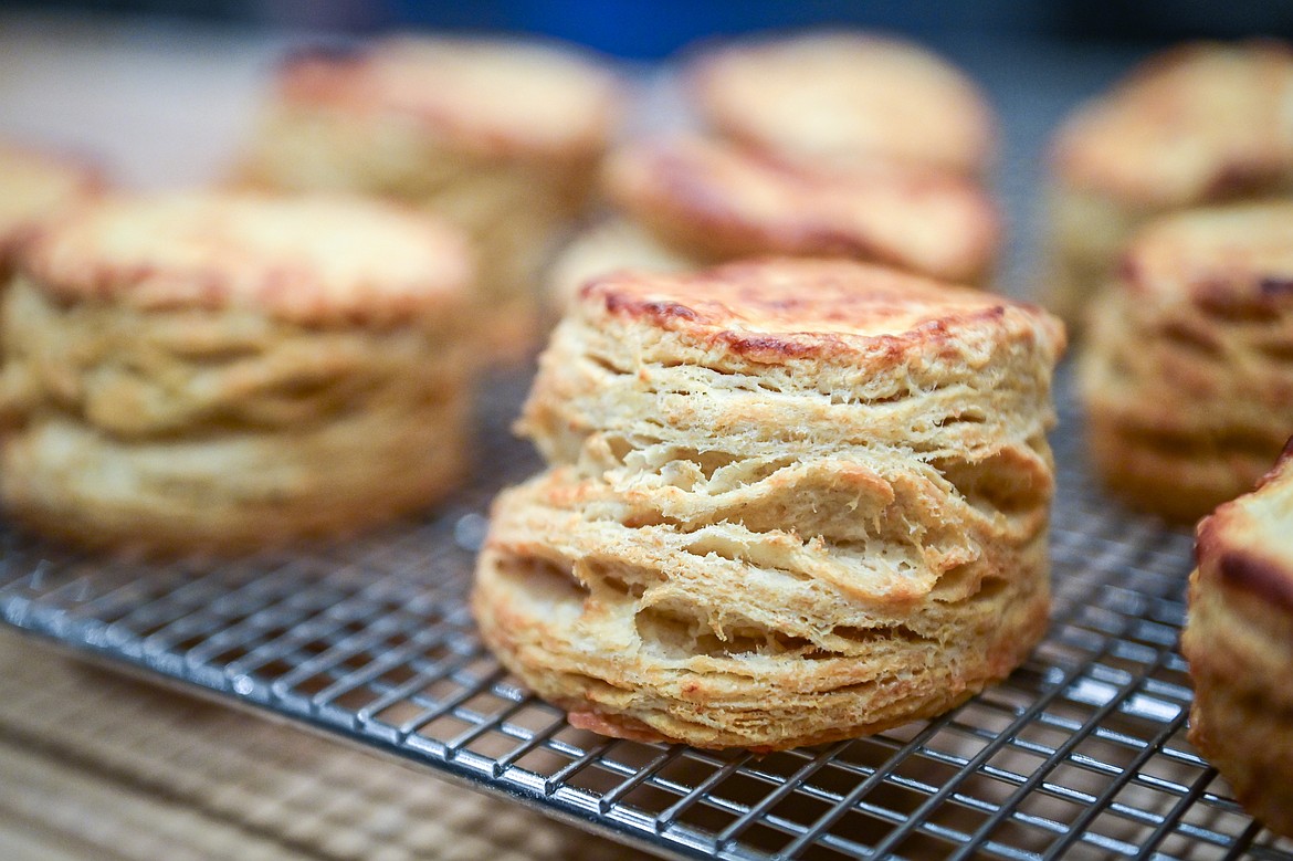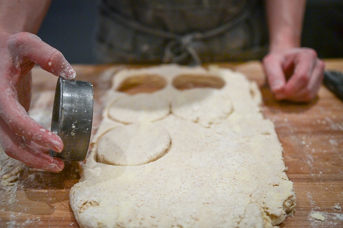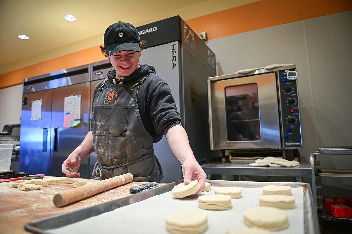 Nico Carlson pulls a batch of fresh buttermilk biscuits from the oven at Uptown Hearth. A rich, buttery smell fills the bakery located behind the cafe kitchen.