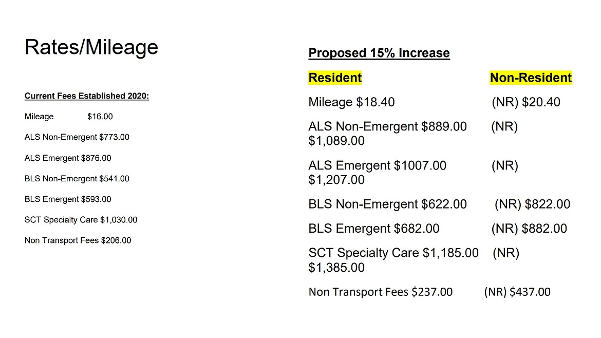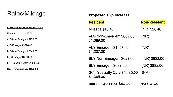 To help raise expenses, the district also proposed an increased non-resident rate that would bill non-residents an extra $2 per mile and an additional $200 per service.
