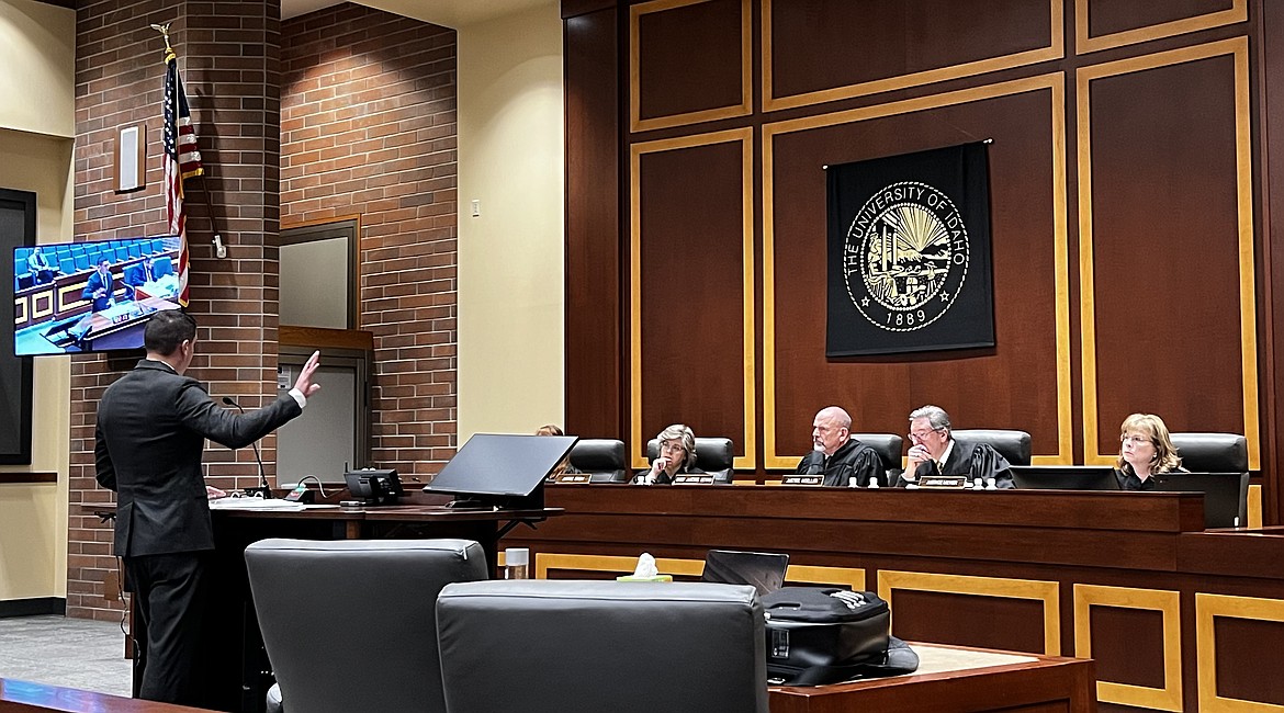 Justices G. Richard Bevan, Robyn Brody, Gregory Moeller, Colleen Zahn and Cynthia Meyer heard oral arguments from Shoshone County Prosecutor Benjamin Allen and attorney David Claiborne inside the courtroom of the Menard Law Building concerning the appeal of a decision over West Fork Pine Creek Road.