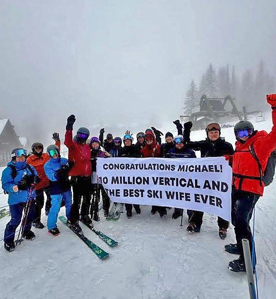 Donnay’s wife, Kerith, and a passel of friends greeted him with a large banner as he completed his 10-million-foot goal on Wednesday, April 2. He continued to ski through April 6, closing day, for a total of 10,347,920 vertical feet.