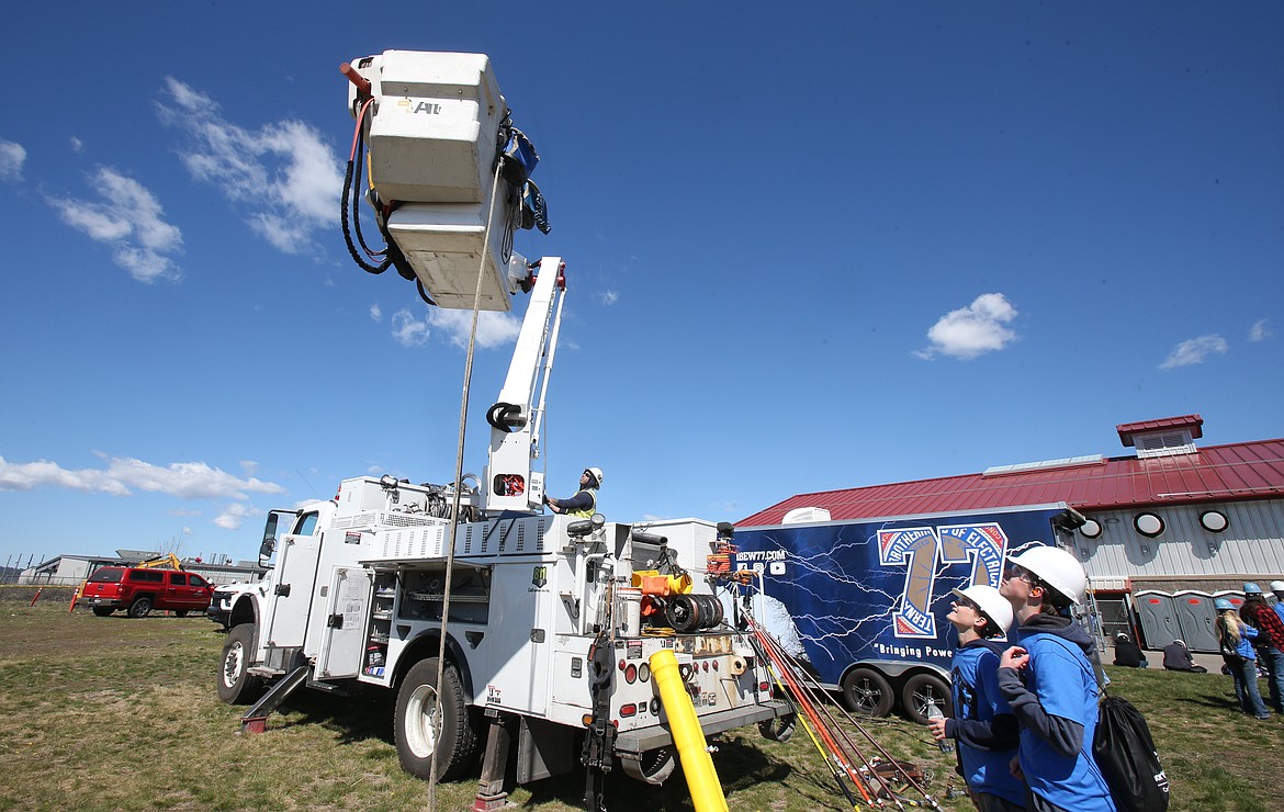 Avista lineman Rich Dudley has been in his line of work since 2009. He operated a bucket truck and showed students all the tools that linemen keep handy in the baskets that carry them to the tops of trees and power poles.