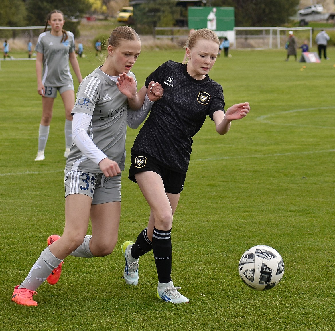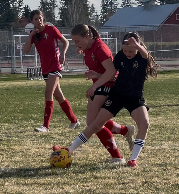 Photo by KARI HYNES The Sting SC 11 Girls Academy DPL soccer team posted back-to-back shutout victories this past week, extending its shutout streak to six consecutive games. Thursday night’s match against WE Surf SC 11G DPL saw the Sting offense explode for 11 goals. Presley Moreau led the charge with a hat trick and an assist, while Kylie Lorona netted two goals of her own. Additional goals came from Payton Brennan, Olivia Hynes (off a corner from Olivia Nusser), Constance Ovendale, Kenzie Dolan, Riley Greene, and Harper Overland. On Saturday, the Sting SC defeated the Spokane Shadow DPL 5-0. Presley Moreau found the net twice, while Olivia Nusser, Brightyn Gatten and Kylie Lorona each added a goal. Goalkeepers Kenzie Dolan and Constance Ovendale combined for six straight clean sheets. The Sting SC 11G Academy DPL squad now sets their sights on Boise, where it kicks off the State Cup round robin on Friday. Pictured is Olivia Hynes, right, in position for control of the ball.