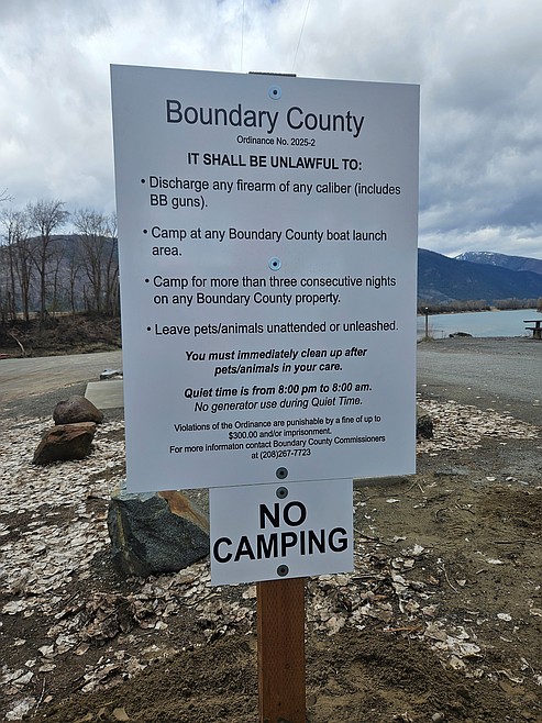 “No Camping” signs have been posted at the following county properties: Deep Creek Loop Boat Lauch, Rocky Point Boat Launch, Copeland Boat Launch, Porthill Boat Launch, and at Riverside Park.