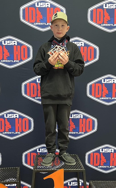 See caption: Dalton Regehr, 12, of the Bonners Ferry Wrestling Club shows off his medals after a successful run at the USA Idaho State Championships held Friday, April 18 and Saturday, April 19 at Canyon Ridge High in Twin Falls. Regehr, competing primarily in the 100-pound weight class of the 14U division, went 4-0 in Greco-Roman, winning three matches by pin and one by technical fall, and 3-0 in Freestyle, winning all of those matches by technical fall, to capture gold medals in both styles. Adding in the gold medal he won at 90 pounds while representing the Sandpoint Legacy Wrestling Club at the Idaho Folkstyle State Championship held Friday, March 21 and Saturday, March 22 at Skyview High in Nampa, Regehr has officially captured the triple crown of Idaho State Championships. As if that wasn't impressive enough, Regehr, just a seventh-grader, actually doubled back in the 100-pound weight class of the 16U division in Greco-Roman and Freestyle and placed fourth and fifth, respectively, competing against wrestlers as old as sophomores in high school.