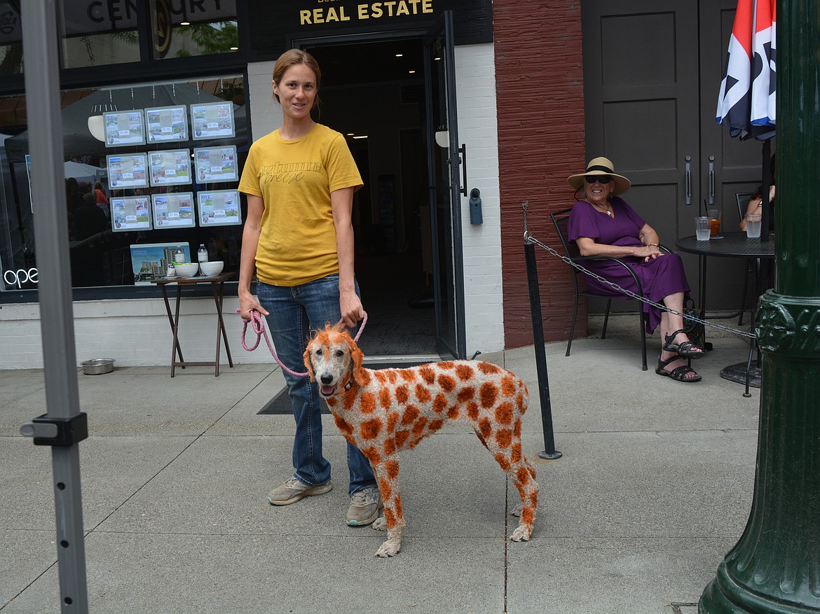 One notable duo strolling among the vendors was Audrey Hallwachs and her poodle, Eleanor, who was decorated with dog-safe hair dye to create an orange spot effect.