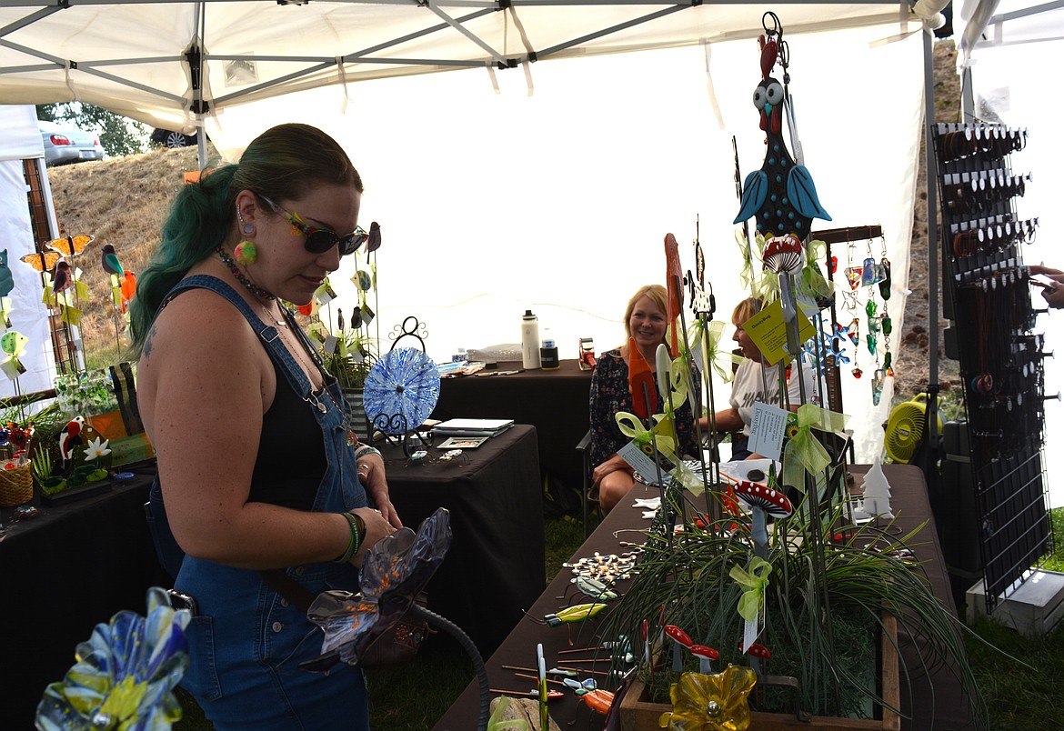At North Idaho College, Terry and Matt Klute walked around the Art on the Green booths safely brandishing blown glass flower spears to safely stow in their car before heading back to spend time at the Doozy Bug booth, with their wives, Lis and Nicole Klute.
