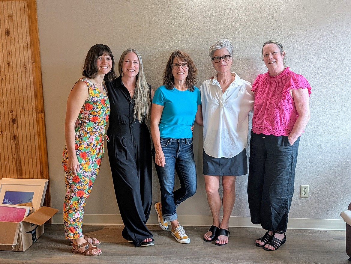 A group of local artists dubbed "A Six Women Collective" pause for a picture while hanging their artworks at the Whitefish office space turned gallery on Tuesday, July 5, in preparation for their pop-up art show. From left to right is Jessy Hanson, Alisha Shilling, Heidi Marie Faessel, Olivia Stark and Kage Harp, with Raina Pratt not pictured. (Kelsey Evans/Whitefish Pilot)ARTICLES BY KELSEY EVANS