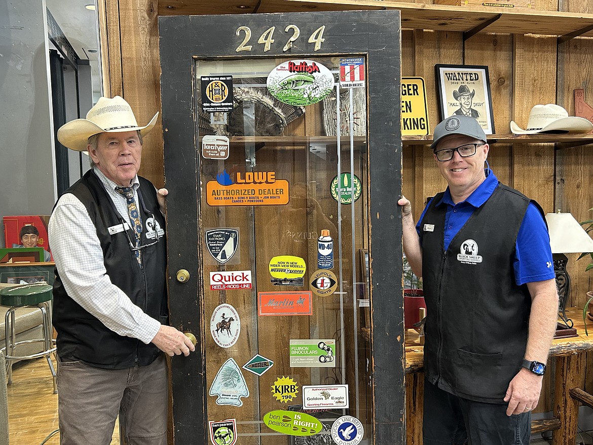 The building is long gone, but the glass door with stickers like “The Famous Flatfish Strikes Again,” “Kershaw out-cuts them all,” and “Fujinon Binoculars ... Light Years Ahead and Guaranteed for Life,” remains, stored safely for decades.