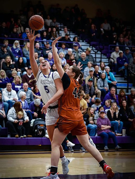 Karstetter said she enjoys the physicality of the sport, too. Her brothers helped instill that in her. When she gets in the post, she welcomes contact. Coming into this year, the Fighting Saints rank second in their conference, whereas in the last few years they’ve ranked first. This has fueled an underdog mindset where she anticipates getting to play with more physicality.