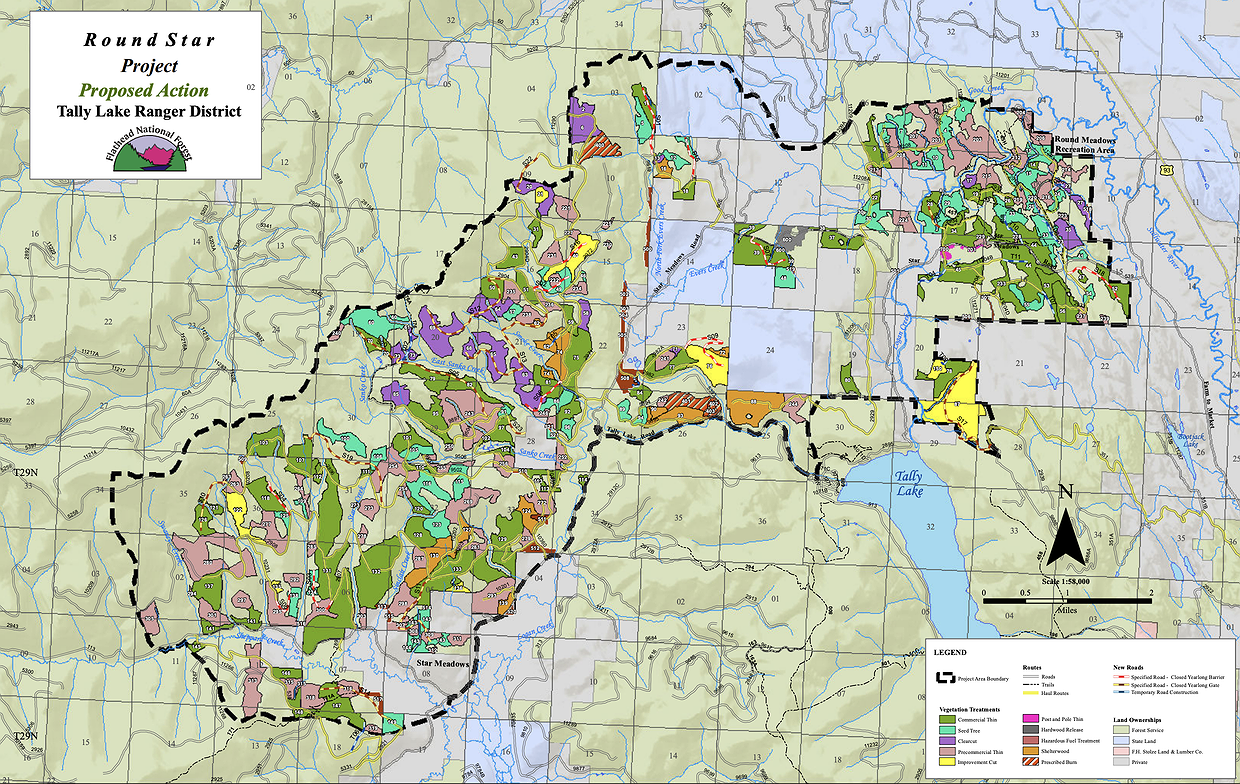The Round Star Project area includes 28,300 acres, 78% of which is national forest land, 7% is state land and 15% is privately owned. The project is primarily (92%) in the wildland-urban interface.