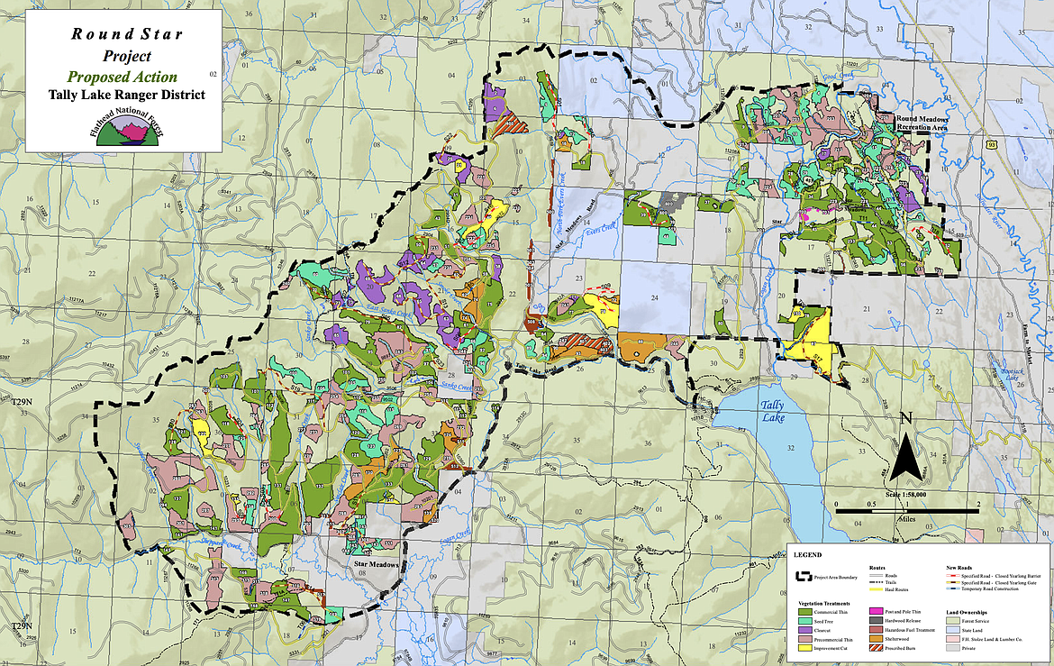The 41,000-acre Cyclone Bill Project area extends southwest from Tally Lake, near Star Meadows residential areas, while the Round Star Project extends northwest from Tally Lake.