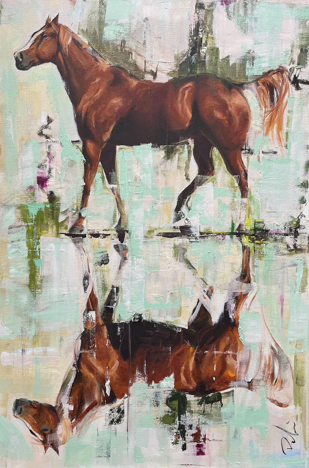 Using brushes, palette knives, scrapers and squeegees with oil paints, Rodriguez depicts his subject matter — horses, cows, buffalo, farms, for example — in a style that blurs realism with the abstract, painting pieces that have the quality of photorealistic, dreamlike collages.