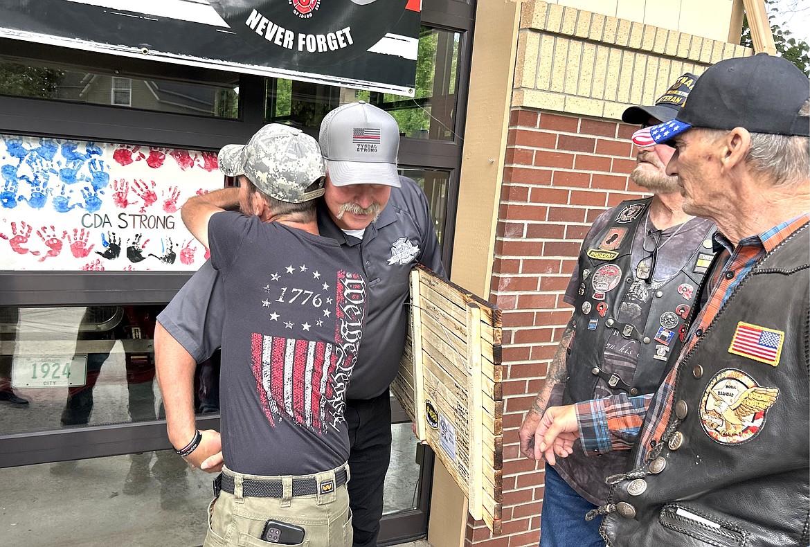 The small group of veterans and wives handed over a custom-made red, white and blue flag. It carried the names of Coeur d’Alene Battalion Chief John Morrison and Kootenai County Fire and Rescue Battalion Chief Frank Harwood, who died in an ambush attack at Canfield Mountain.
