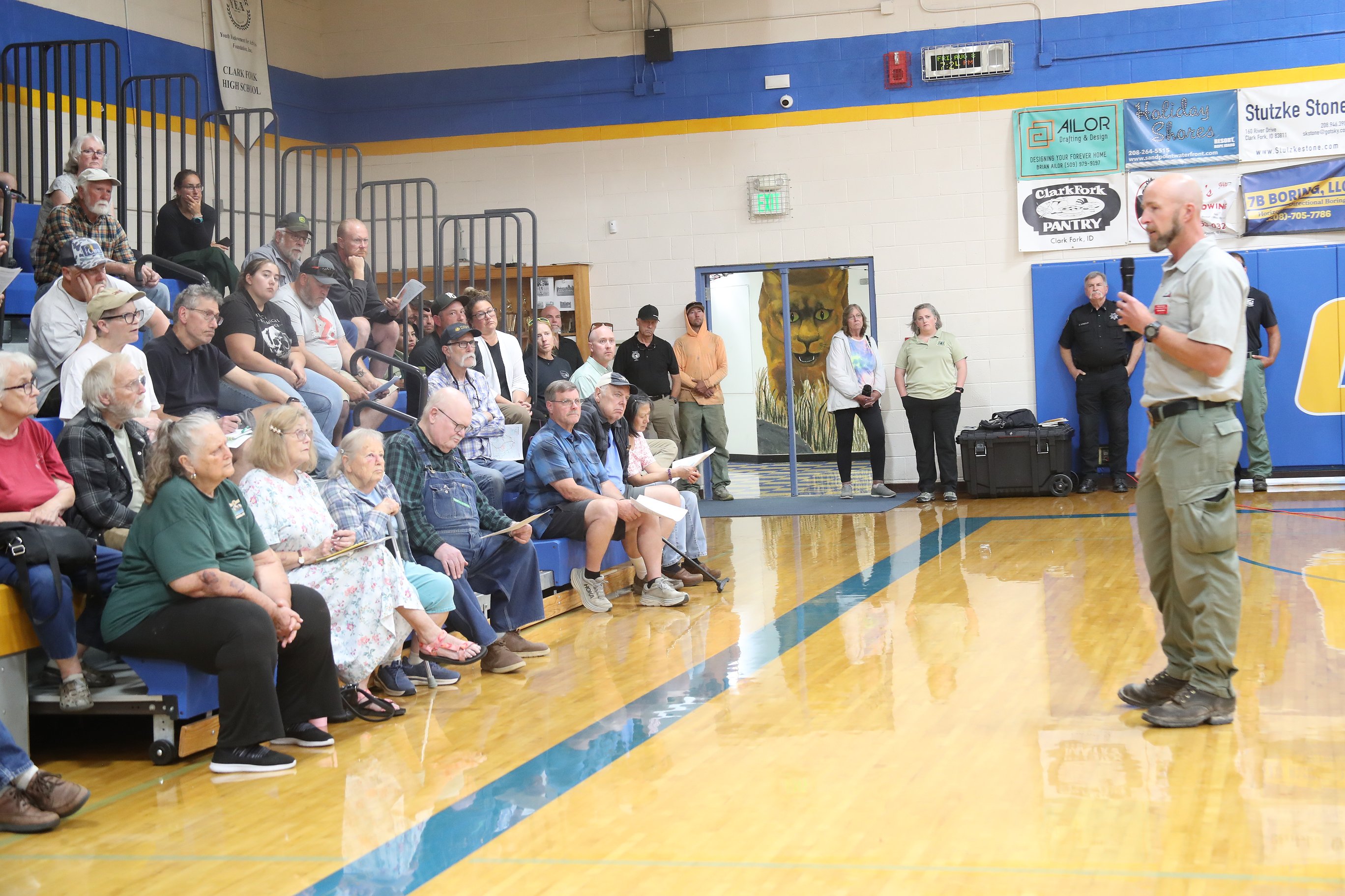 Martin and a host of area officials spoke to about 100 residents from the Hope and Clark Fork area as part of a community meeting to update them on the fire, efforts to battle the large wildfire and potential risk to the community.