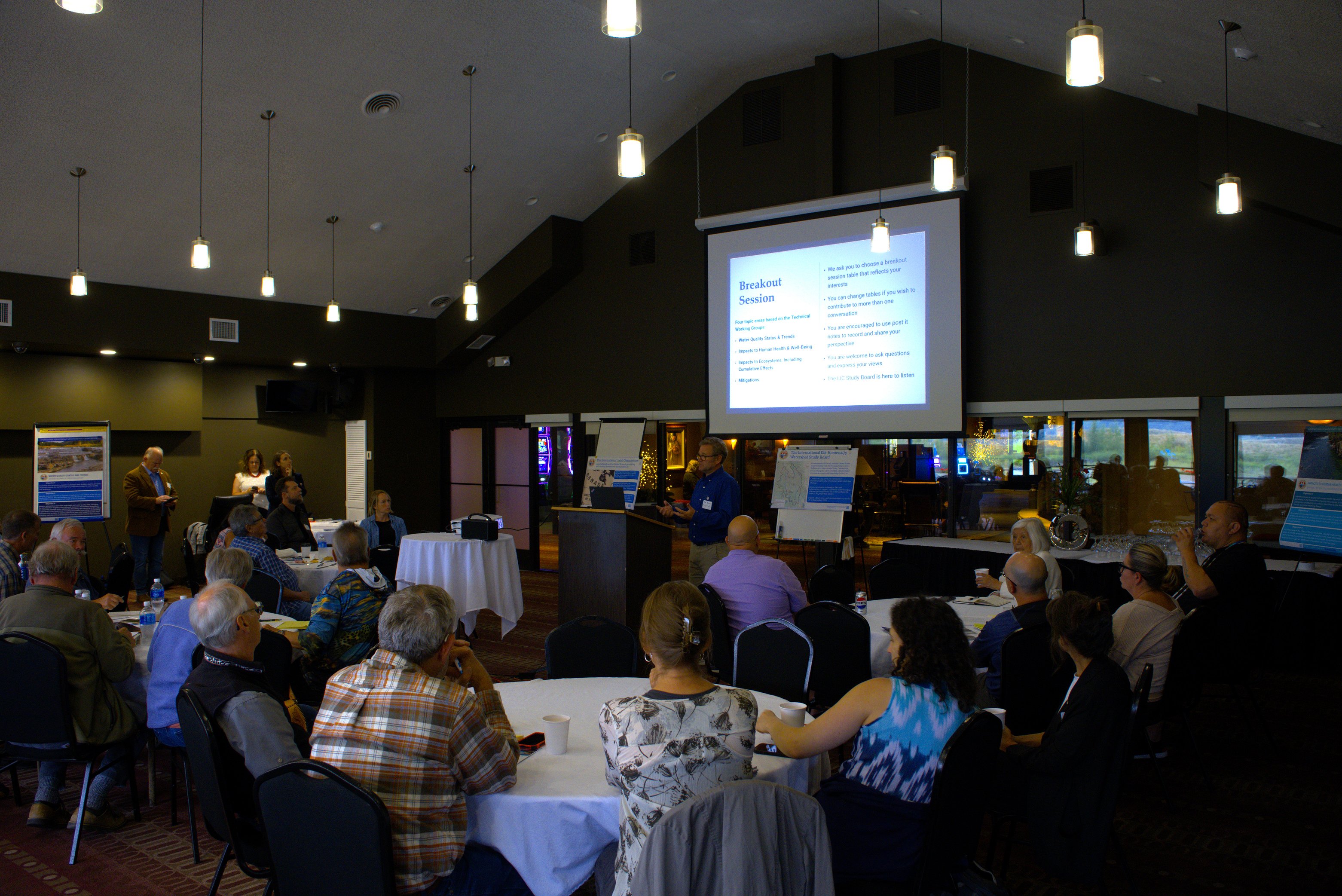 Following introductions, attendees broke into smaller groups, each joined by a study board member, to discuss topics including water treatment and mitigation efforts, the legitimacy of existing research and data, the effects of recently implemented regulatory standards, impacts on the ecosystem such as disrupted food chains, human health concerns, and more.