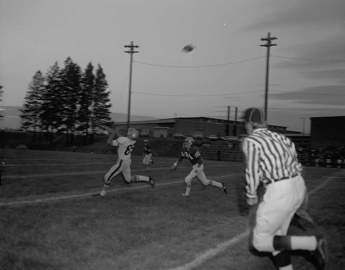 A September 1972 photo by Mel Ruder shows Leach catching the first touchdown pass of the football season from Blades against Cut Bank. Leach was a tight end for the Wildcats and the pair were seniors.