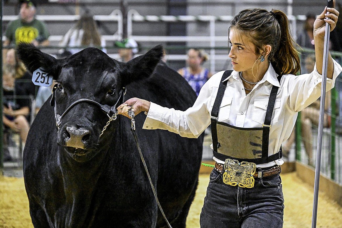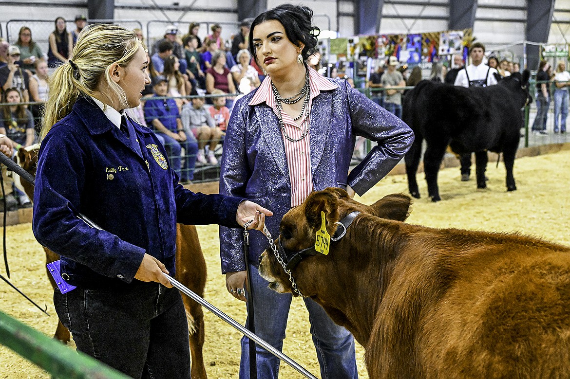 With the final callbacks in the ring, Hanson took time to carefully observe the competitors as they handled their steer around the ring. Competitors would tap hooves to get steers into a proper stance, scratch the brisket with show sticks and make small loops when needed to help calm the large bovines — all while trying not to break eye contact with the judge.