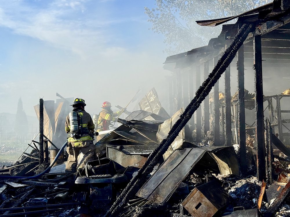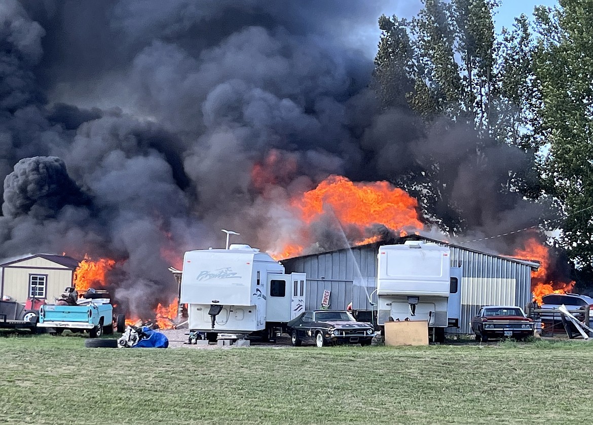 In addition to completely destroying the shop, the fire damaged some outbuildings and four vehicles to varying degrees. A camper sustained heat damage.