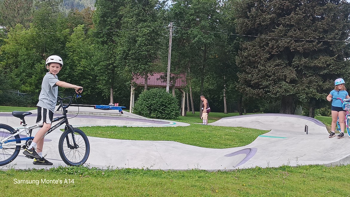 Bowdy Higgins, left, and his sister Winter ride their bikes in the Superior Skate Park while their mother, Shelby and little sister Lyndi walk around the rim on a pleasant morning.