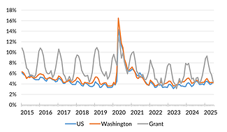Despite a few recent layoffs, data from WESD indicates that Grant County is doing a bit better than the state unemployment rate as of June. Data from that month indicates the rate at 4.4% of the county’s roughly 46,000 workers. Unemployment is up by 0.2% year over year as compared to June 2024. The number of Grant County residents in the workforce decreased by 2,643 from the prior year to 46,291 workers, employed or not. That roughly matches changes in the total number of employed workers at 44,237 in June, a decline of 2,639 employed residents as compared to the prior year.