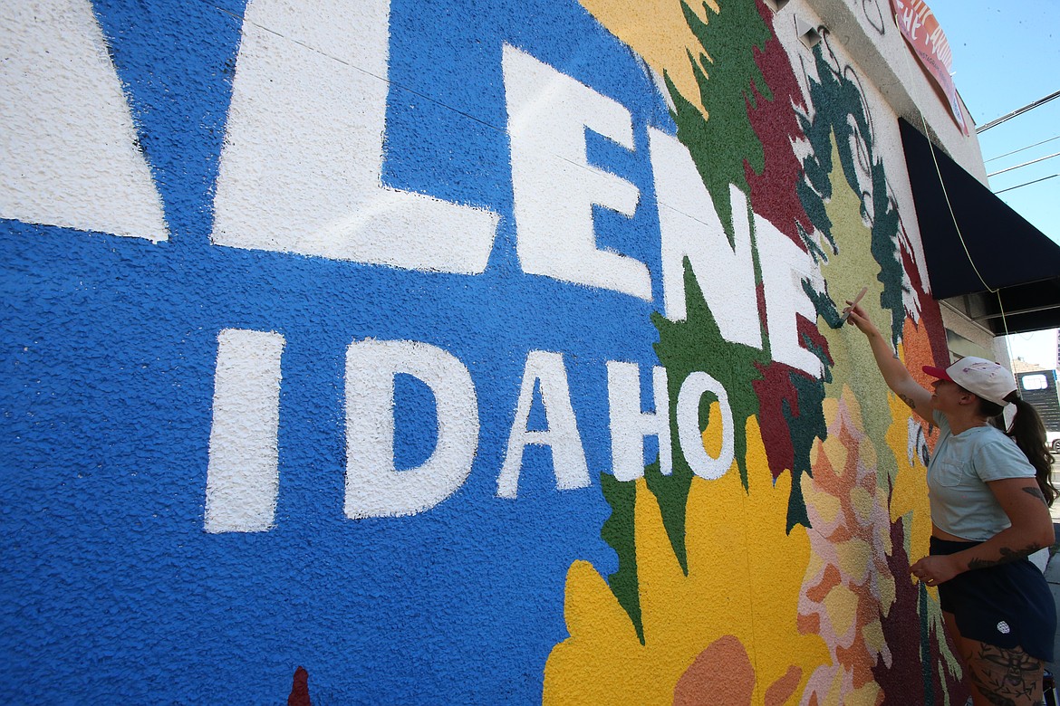 Artist Gabrielle Lewis continues working Aug. 12 on the "Welcome to Coeur d'Alene, Idaho" community-funded mural on Third Street between Sherman and Lakeside avenues. DEVIN WEEKS/Press
