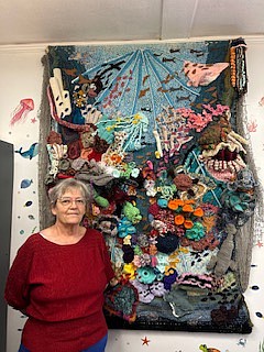 Kelsey uses wool, alpaca, cashmere, acrylic and all kinds of yarns for her creations and one will see the variety in "The Reef" that is on now display.