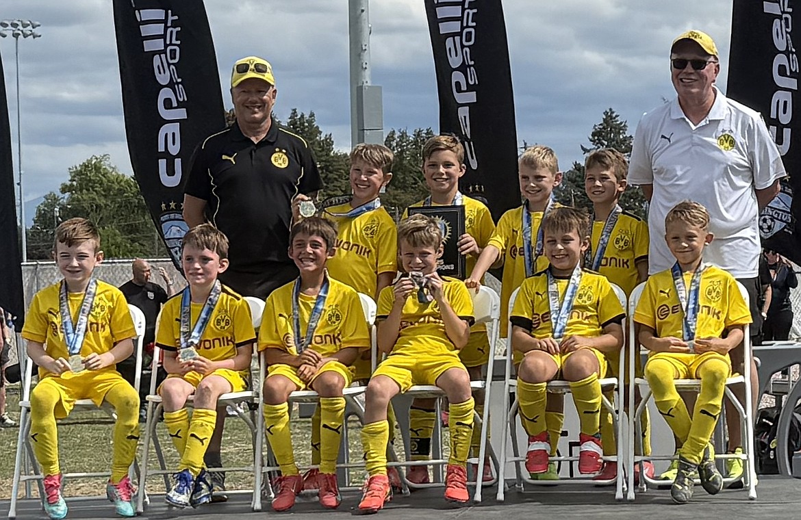 Courtesy photo The BVB International Academy Idaho U10 boys soccer team traveled to Puyallup, Wash., for the River Jam Challenge, hosted by Washington Premier Football Club, Aug. 15–18. The BVBIA team went undefeated through five matches and closed out the weekend with a championship victory over Washington Premier B16-Gold. In the front row from left are Colin Happeny, Kieran MacKeage, Onyx Barnes, Greyson Guy, Mitchell Volland and Xander Werner; and back row from left, coach Matt Werner, Waylon Wood, Hugh Erickson, Weston Kramer, Grayson Martino and coach John O'Neil.