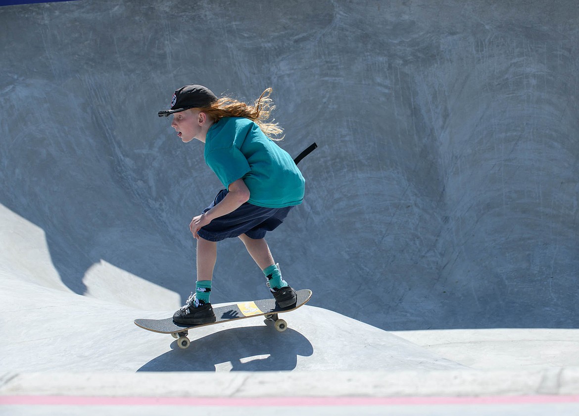 Kids skate around the new track during the grand opening of Sćilíp Skatepark on Aug. 23. (Emily Messer/Leader)