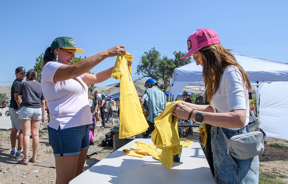 Danielle Matt, the CSKT Sćilíp representative, grabbed a shirt from the Montana Pool Service table on Aug. 23. (Emily Messer/Leader)