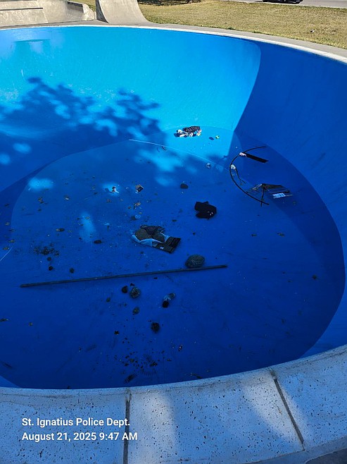 On the night of Aug. 21 an individual or possibly individuals threw rocks, a metal pole, garbage and other debris into the St. Ignatius Skatepark bowl along with filling it with three to four feet of water.