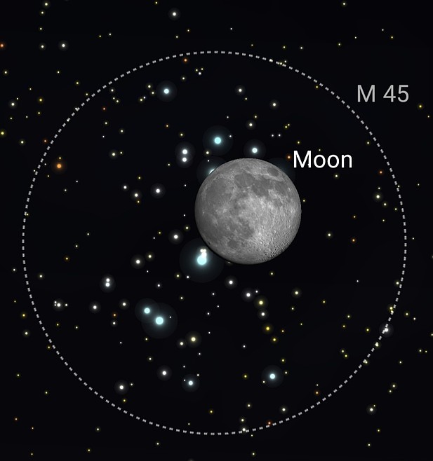 Dec. 3 — The moon in front of the Pleiades (M45)