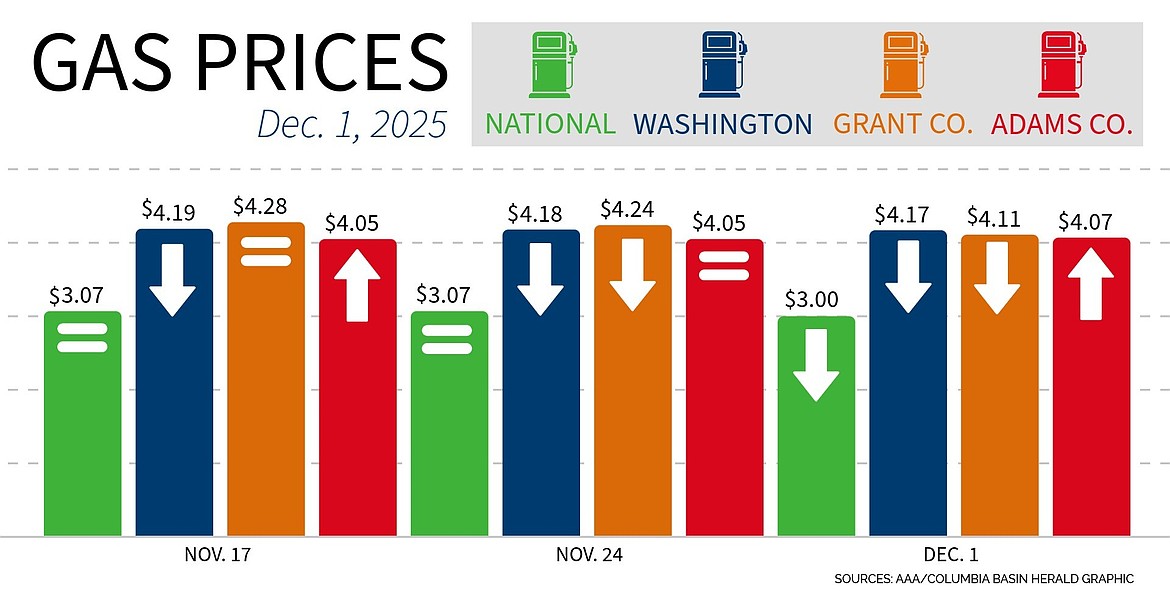 MOSES LAKE — Grant County, Washington and the national average gas prices saw decreases this week. However, Adams County saw a slight increase in average fuel prices this week.