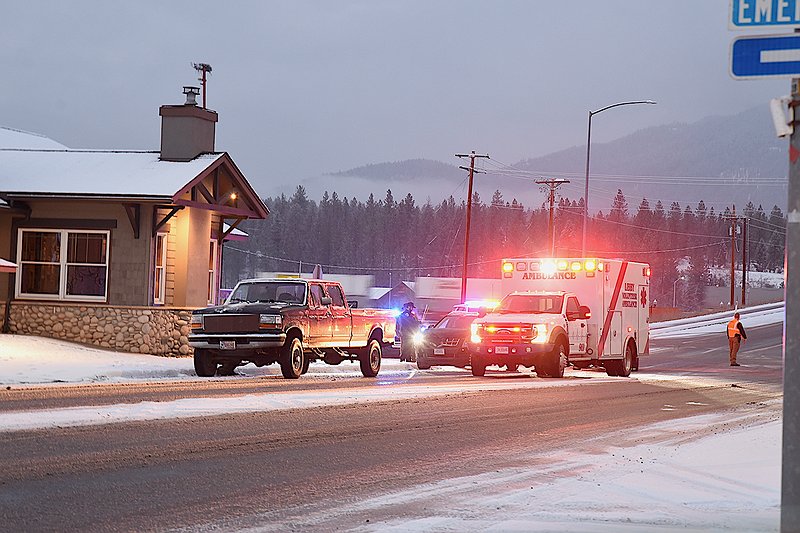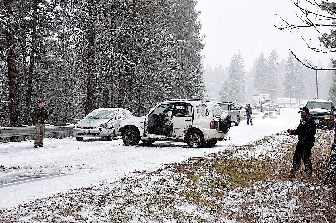 Snow showers created slick road conditions Monday afternoon across Northwest Montana, resulting in several traffic accidents, including this one on Kootenai River Road, just outside Libby. Three cars were involved and multiple people were transported by ambulance for medical care.