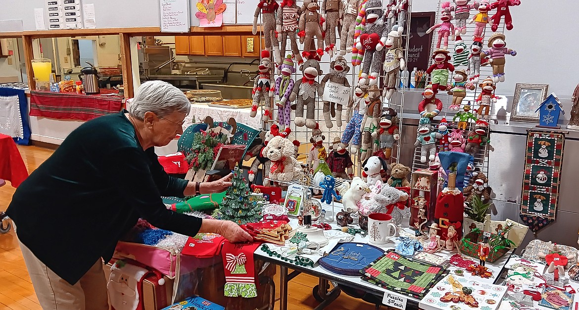 Inside the kitchen area, Connie Dove, who works in the school kitchen, displayed her crocheted items on one end of the counter and an array of freshly baked treats on the other. Two festively decorated tables were set up nearby, offering visitors a welcoming place to sit, enjoy goodies, and share conversation.