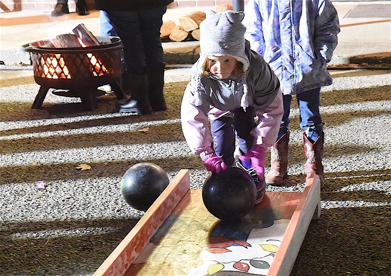 A young holiday reveler tries her hand at bowling Saturday, Nov. 29, 2025, at the City of Troy's annual Christmas tree lighting. (Scott Shindledecker/The Western News)