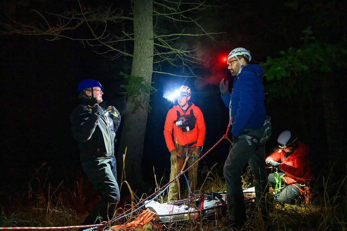 Using a genius system of pulley and rope, a single person can easily pull a gurney up a hill, Sullivan explains. But getting the knots and the system correct takes plenty of practice, particularly on a cold night with just the light of a headlamp.