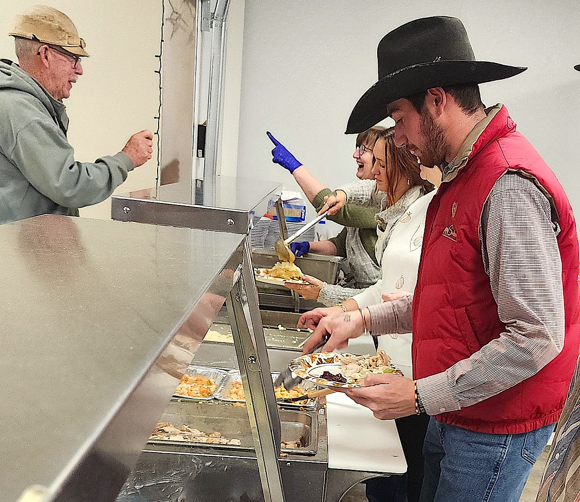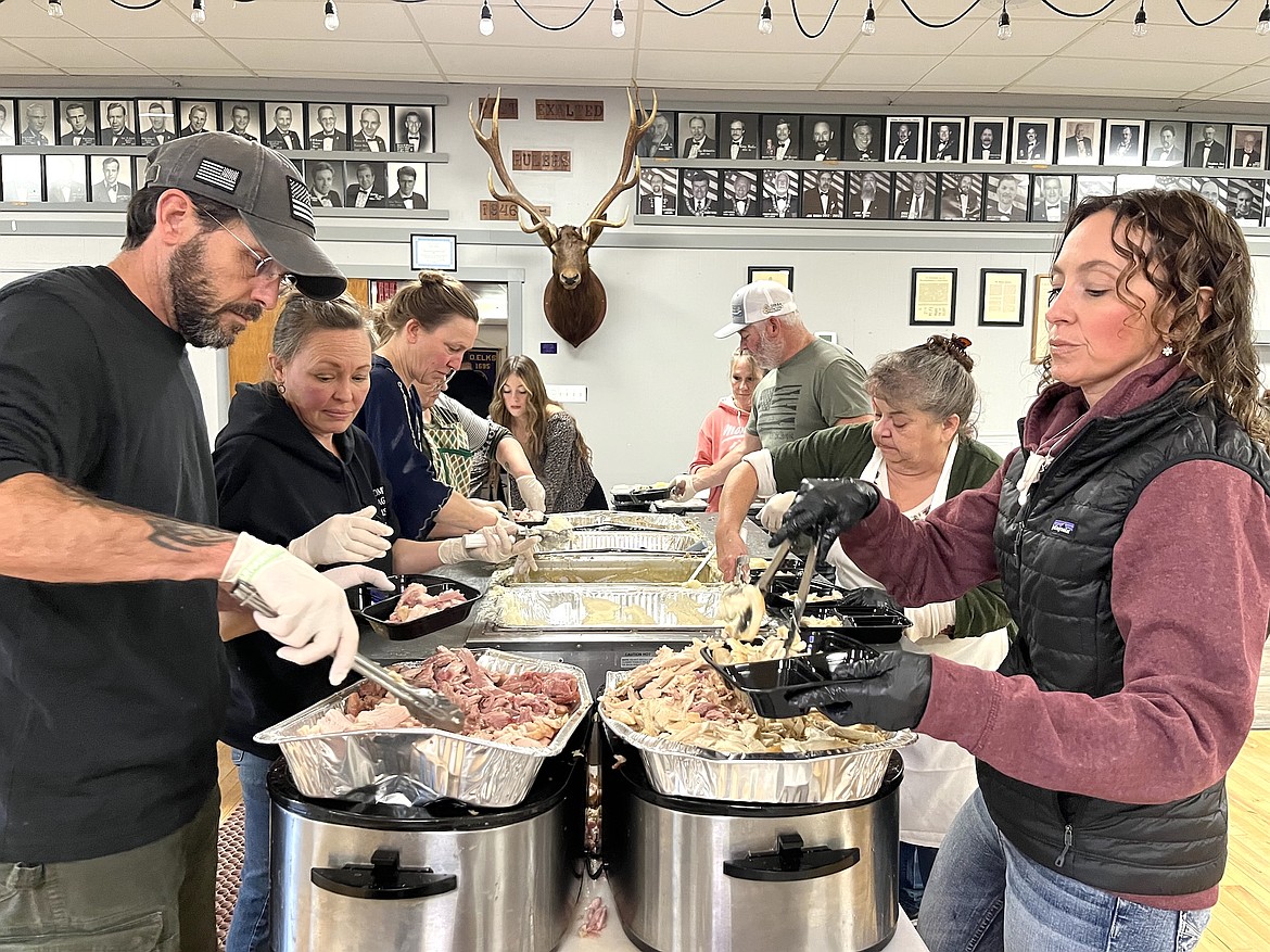 According to Brandy Chisholm, who with her husband, Tom, has volunteered at the dinner for years, 24 turkeys were roasted. As tradition dictates, Valley Bank and Glacier Bank staff peeled 100 pounds of potatoes donated by Lake Farms on Thanksgiving eve. The spuds were boiled and mashed with lots of butter and cream for the feast.