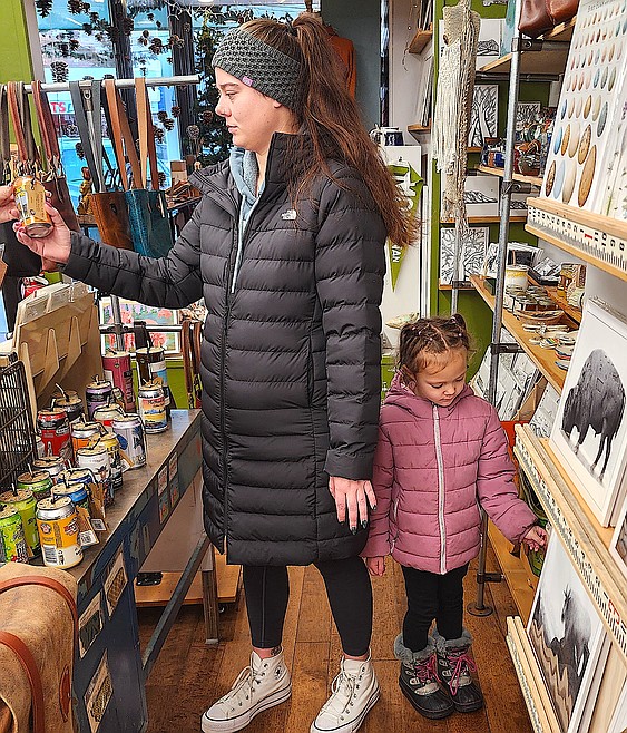 Giant Christmas tree ornaments, huge peppermints, and evergreen boughs framed the front window of Little Shop Montana. Mackenzie Sly and her sister-in-law, Sierra, each toting one of Mackenzie’s twins, Shania and TomTom, were perusing the eclectic mix of jewelry, stickers, clothing, vintage items, and books in the store.