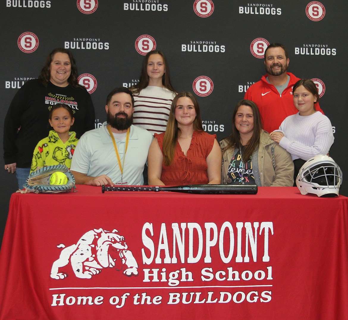 Full caption: Sandpoint's Arah Stevens recently committed to continue her softball career at Olympic College (NWAC) in Bremerton, Wash. Stevens, a third baseman and catcher, joined the Lady Bulldogs' squad as a junior and immediately made an impact, garnering 5A All-Inland Empire League honors. The standout senior, who is gearing up for a big season ahead, tallied a team-high .388 batting average and .457 on-base percentage to go along with a team-high 26 hits, including eight doubles, a triple, two home runs, 10 walks, 21 RBI, 13 runs scored and a stolen base across 81 at-bats and 23 games played last season. On defense, Stevens, also a key member of The North 18U travel softball team, boasted a .828 fielding percentage as she tallied 56 total putouts. She'll be joining a Lady Rangers team that went 24-26 overall and 18-14 in conference play a year ago. "She'll bring some stability and leadership — she works well with others — and she just works hard on her own," Sandpoint High head coach Leah Platt said of what Stevens brings to the table for a collegiate program. "She's solid behind the plate and at third base, but can really play any position. Behind the plate, she has a calm demeanor and has the ability to work with every pitcher. Her hitting will certainly be what keeps her in the lineup. From what we've seen this past season and this summer, she can really put the ball in play." Pictured, back row, from left are head coach Leah Platt, Marlee Stevens (sister), and Sandpoint High Athletic Director TJ Clary. Front row, from left are Iris Stevens (sister), Corey Stevens (father), Arah Stevens, Tela Stevens (mother) and Harper Stevens (sister).