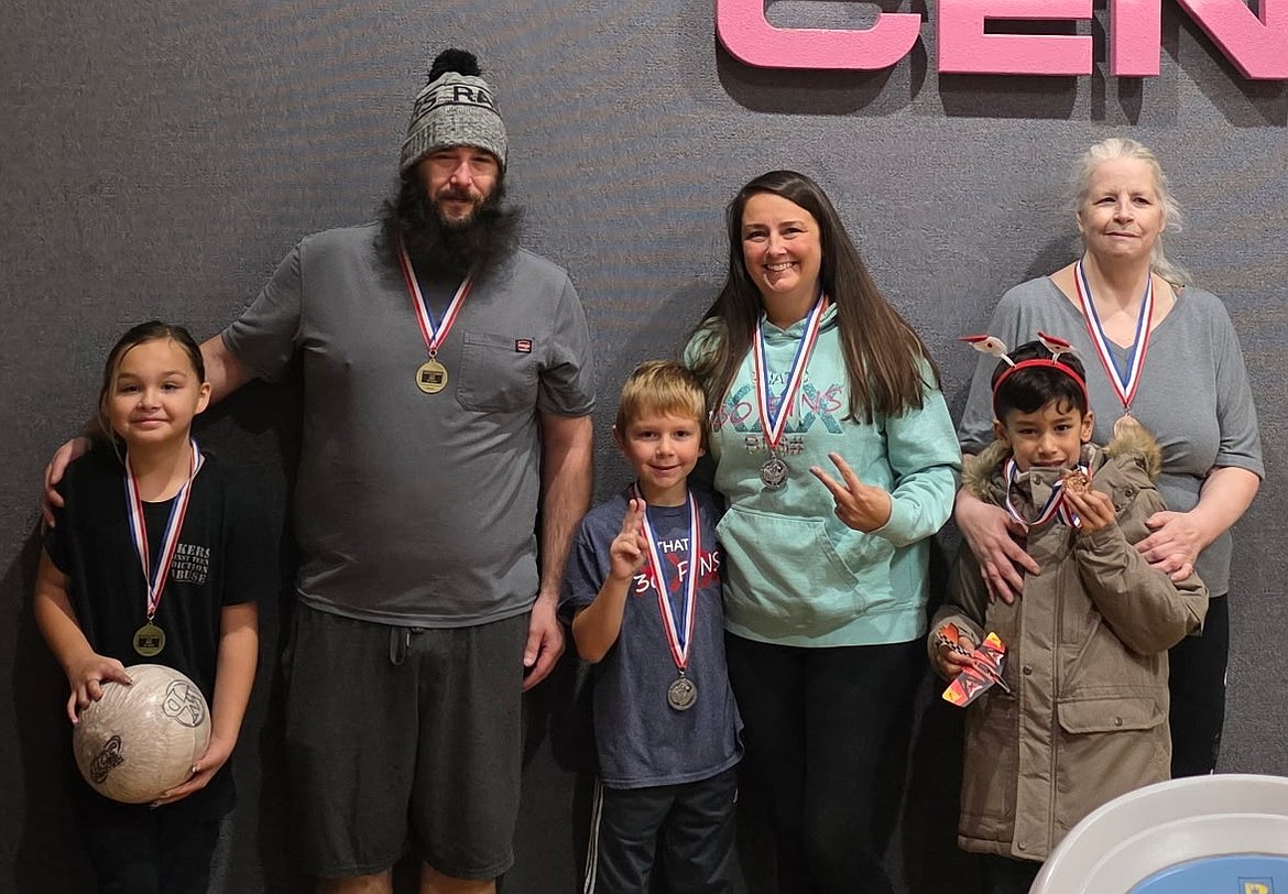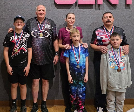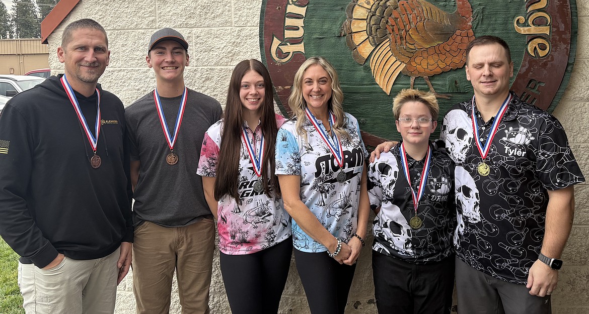 Courtesy photo Winners in the Juniors division at the annual Thanksgiving Youth Adult Scotch Doubles tournament on Saturday at Sunset Bowling Center in Coeur d'Alene are: First place, Drake Sampert/Tyler Orlowski; second place, Brooke Boykin/Jamie Boykin; and third place, Kayden Parks/Steven Parks. Pictured from left are Steven Parks, Kayden Parks, Brooke Boykin, Jamie Boykin, Drake Sampert and Tyler Orlowsi.