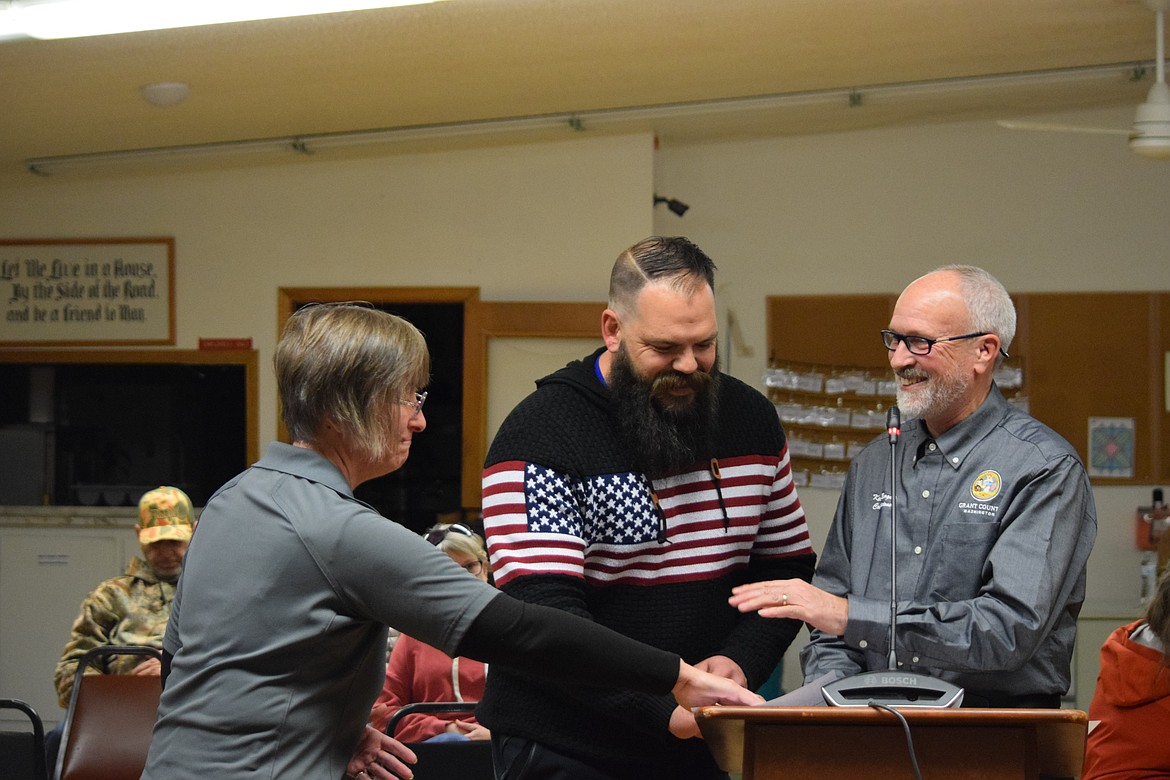 Mayor Peter Sharp, center, was elected by voters during the 2025 General Election, receiving around 53% of the vote, or 206 votes. He has been previously appointed by the Soap Lake City Council during a Sept. 2024 meeting. City Clerk Jody Siebert, left, has both Sharp and County Commissioner Kevin Burgess, right, sign Sharp’s oath of office.ARTICLES BY NANCE BESTON