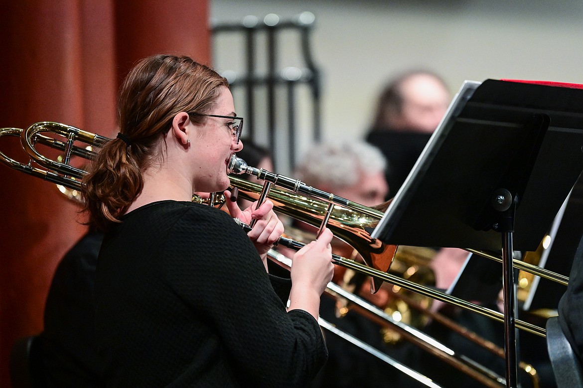 Trombonist Marin Colley performs with the Flathead Valley Community Band during their Fall Fantasy Concert held at Flathead High School on Wednesday, Nov. 12. (Casey Kreider/Daily Inter Lake)