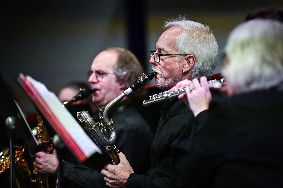 From left, baritone saxophonists Cris Linden-Jones and David Martin and flutist Lois Sturgis perform with the Flathead Valley Community Band during their Fall Fantasy Concert held at Flathead High School on Wednesday, Nov. 12. (Casey Kreider/Daily Inter Lake)