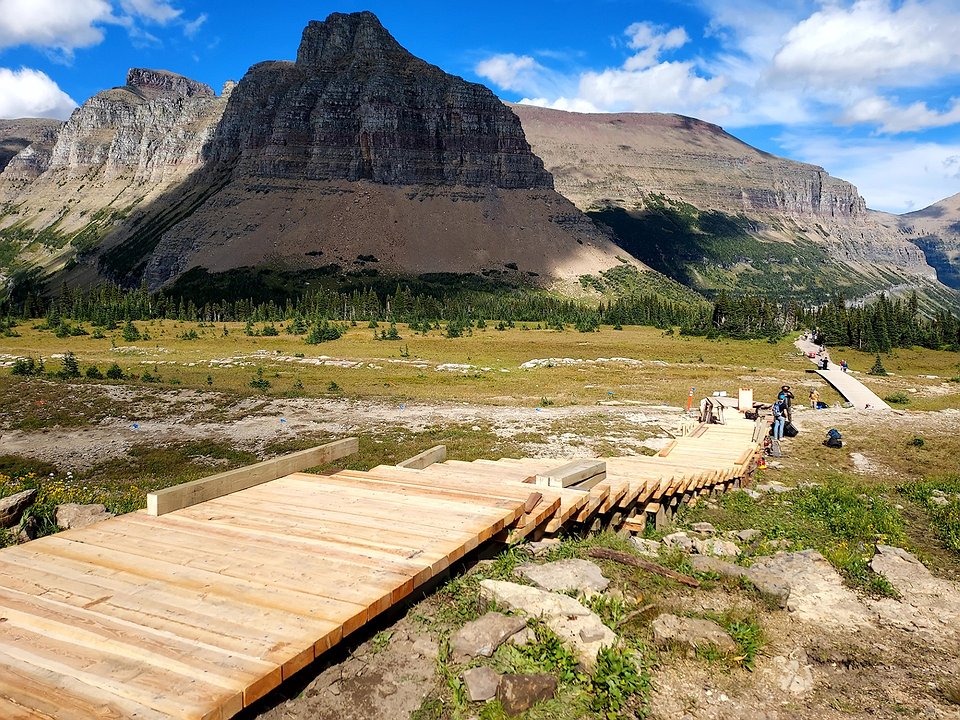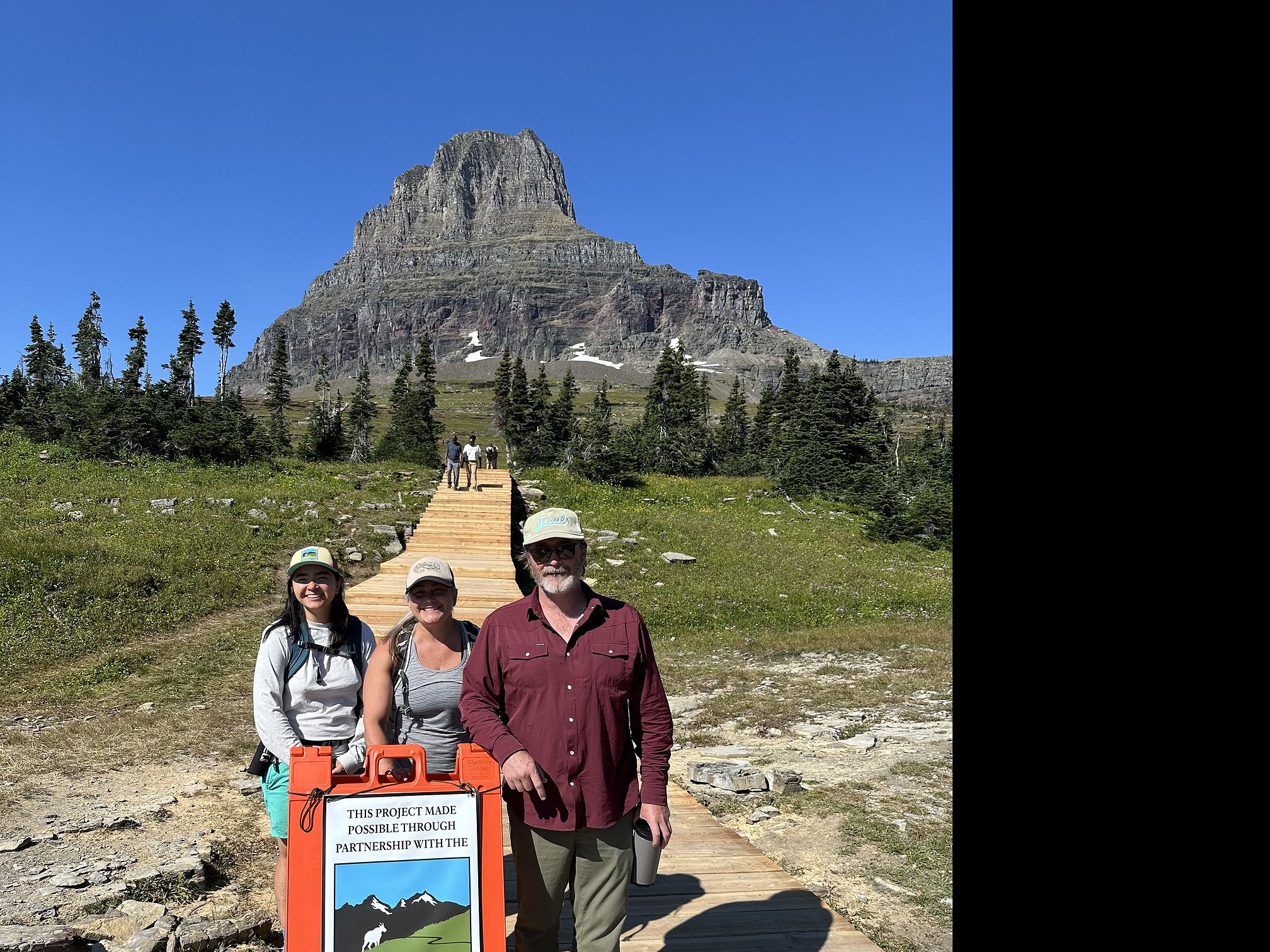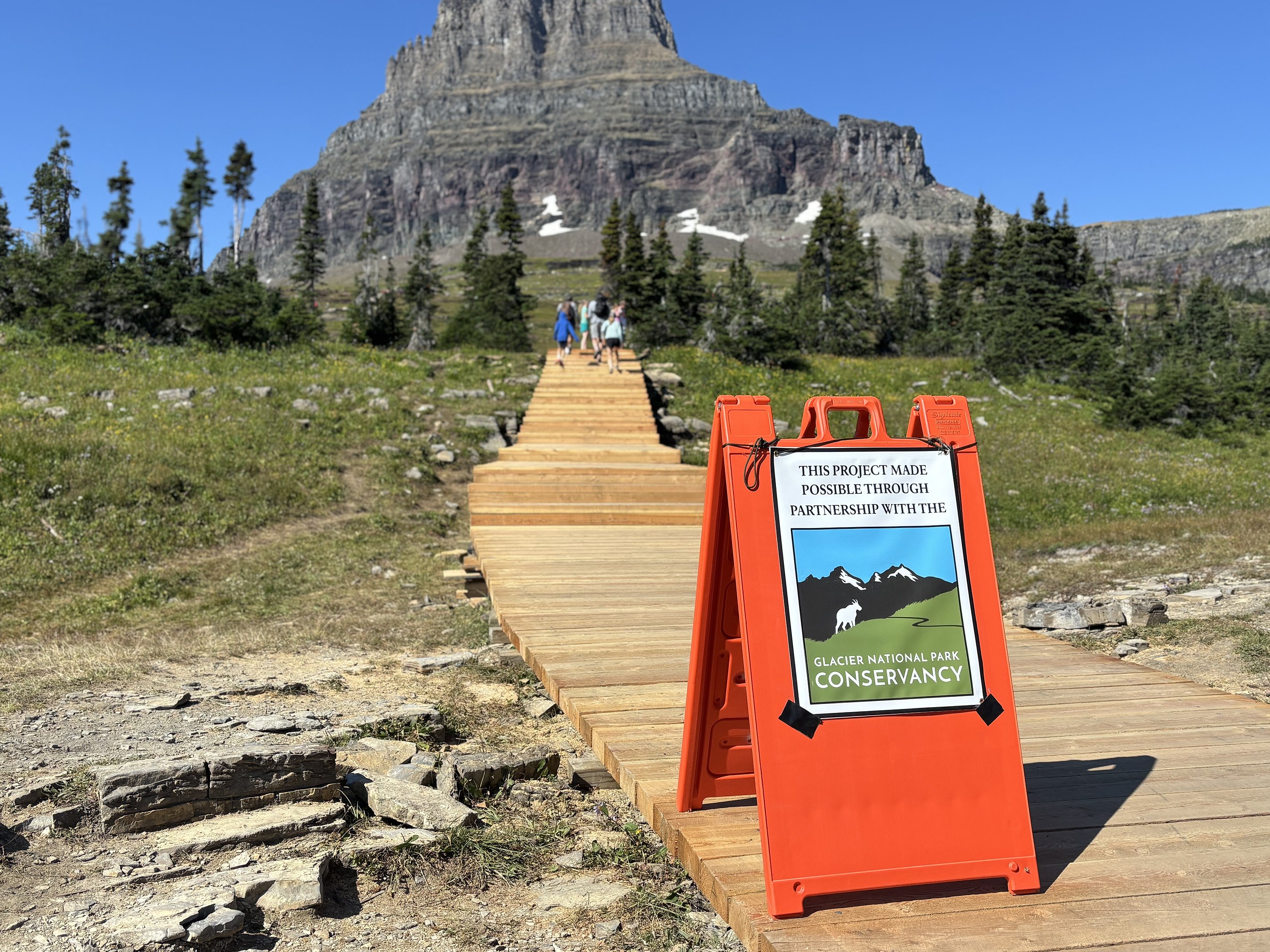 The conservancy’s Community Partnerships Lead McKenna Quick led a project visit with Carlson this summer to show progress on the boardwalk maintenance happening on the Hidden Lake Overlook trail at Logan Pass.