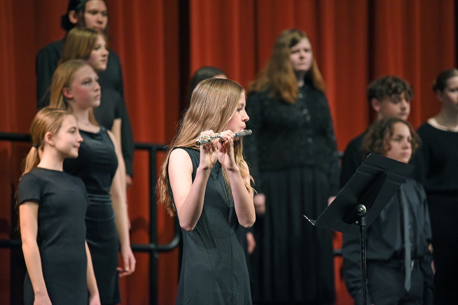 Elia Hill plays the flute as the Whitefish Middle School choir performs "Shalom Chavarim." (Kelsey Evans/Whitefish Pilot)
