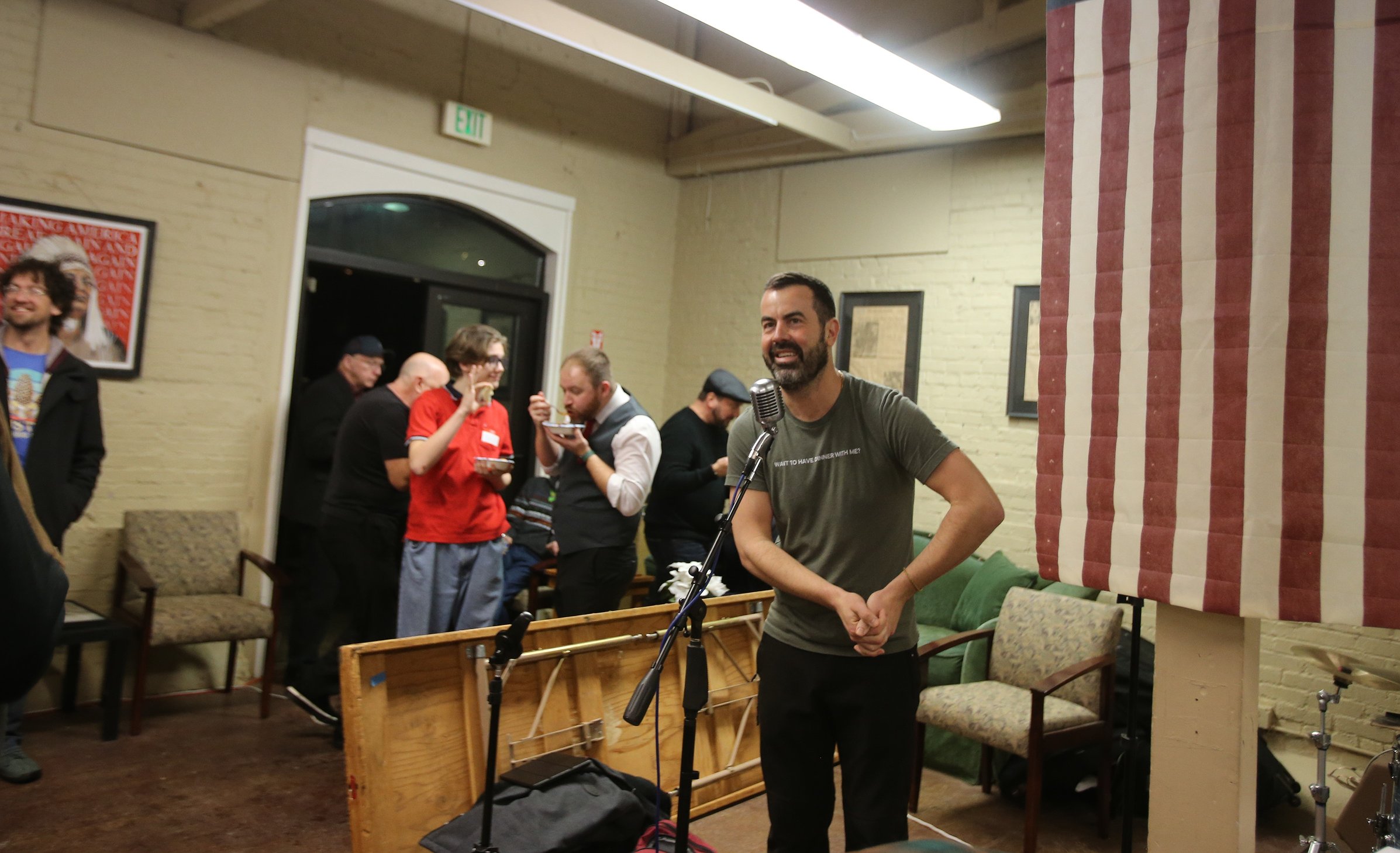 People trickled into HREI from the rainy night, bringing donations of clothing and toys for children in need, as well as sharable dishes and a few bucks for the band.