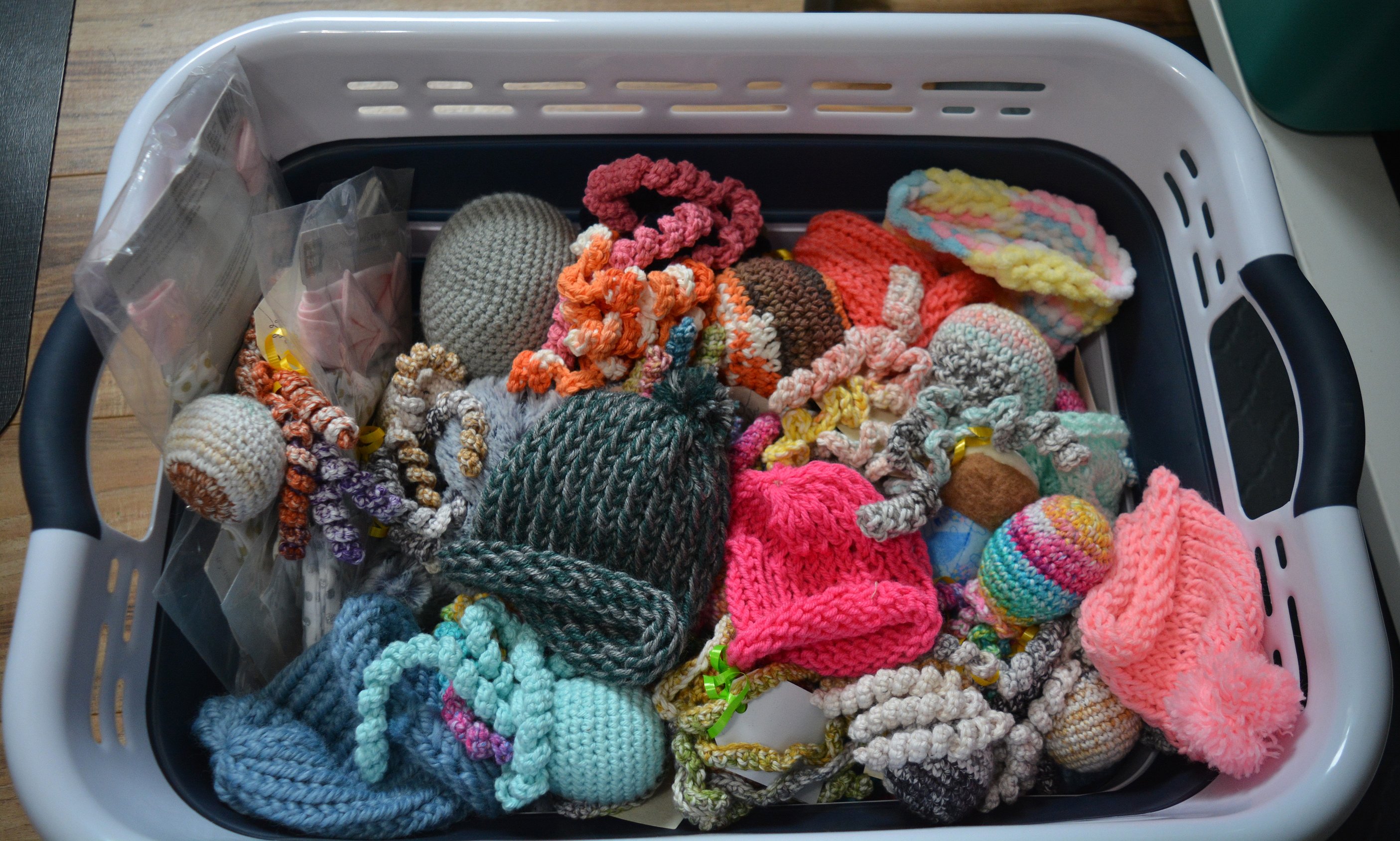 Items in the Fallon’s Flight NICU care cart include electrolytes, mouthwash, hair ties and pre-washed baby swaddles, journals, pens, notebooks, footprint pads, blankets, sleep sacks and pacifier holders.